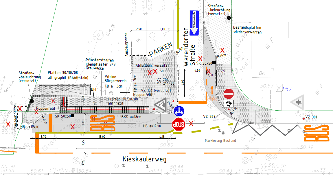 Die derzeit überbreiten Fahrstreifen des Kieskaulerwegs werden auf die Standardbreite von 3,25 m reduziert. Um den Durchgangsverkehr aus dem Wohnviertel fernzuhalten wird die Warendorfer Straße in eine Einbahnstraße umgewandelt. Damit entfällt auch das behindernde Linksabbiegen vom Kieskaulerweg in die Warendorfer Straße. Der Fahrradverkehr kann die Warendorfer Straße weiterhin in beide Richtungen nutzen. Dafür wird im Kreuzungsbereich eine sogenannte Fahrradschleuse eingerichtet.