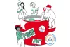 Cartoon  von Menschen am Tisch mit bunten Zetteln