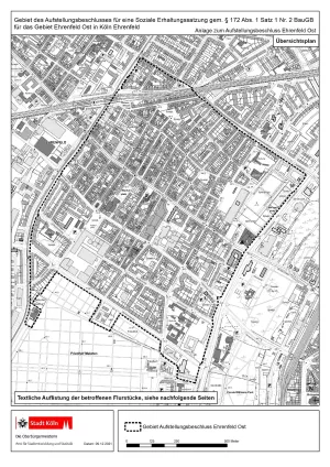Der Stadtentwicklungsausschuss des Rates der Stadt Köln hatte in seiner Sitzung am 7. April 2022 den Beschluss über die Aufstellung einer Sozialen Erhaltungssatzung für das Gebiet "Ehrenfeld Ost" gefasst. Bereits mit dem Beschluss über die Aufstellung der Sozialen Erhaltungssatzung können Vorhaben wie Rückbau, Änderung und Nutzungsänderung baulicher Anlagen für einen Zeitraum von bis zu zwölf Monaten zurückgestellt beziehungsweise vorläufig untersagt werden. Damit ist der Aufstellungsbeschluss bereits im Vorgriff auf eine mögliche Satzung ein wirksames Sicherungsinstrument.