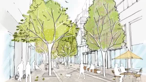 Der neue Boulevard wird beidseitig von Bäumen gesäumt. Diese stehen nicht, wie oftmals bei Straßen üblich, in Reih und Glied, sondern sind locker über den Straßenraum verteilt. Die Bestandsbäume bleiben erhalten und werden in die neuen Baumstellungen integriert.