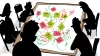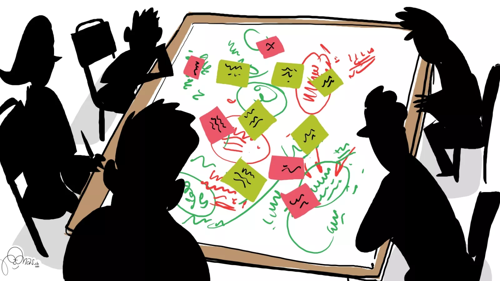 Cartoon  von Menschen am Tisch mit bunten Zetteln