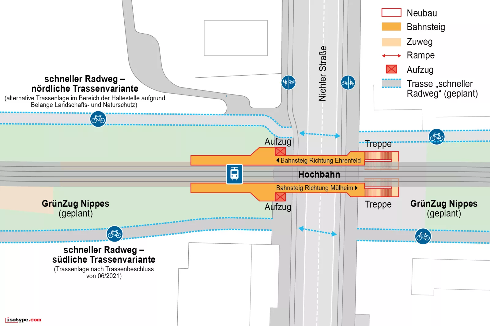 Die bestehende Stadtbahnlinie 13 verkehrt zwischen Neuehrenfeld und Mülheim in einer Hochlage. Im geplanten Haltestellenbereich liegt das Bestandsbauwerk der Hochbahn bei etwa 5,30 m über der Oberkante des Gehweges. Für die Gewährleistung des barrierefreien Zugangs sind bei der Vorzugsvariante zwei Aufzüge auf der Westseite der Niehler Straße vorgesehen. Mit einem Aufzug je Seitenbahnsteig ist die Barrierefreiheit der neuen Haltestelle gegeben. Neben dieser barrierefreien Zuwegung sind auf der Ostseite der Niehler Straße Treppenaufgänge zu den beiden Bahnsteigen vorgesehen. Hierdurch wird die Haltestelle sowohl östlich als auch westlichen von der Niehler Straße erschlossen.