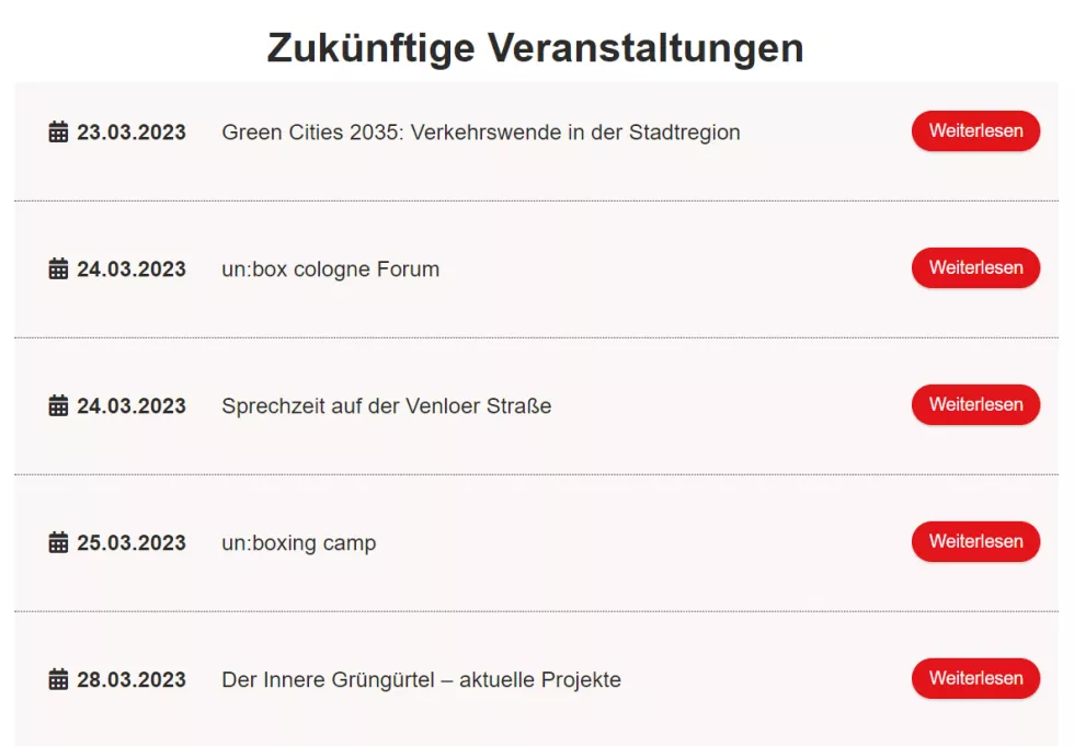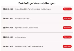 Neben Informationen zu Öffentlichkeitsbeteiligung in Köln, Online-Dialogen und Wissenswertem rund um Mitwirkungsmöglichkeiten von Bürger*innen steht Ihnen auch unser Veranstaltungskalender zur Verfügung.
