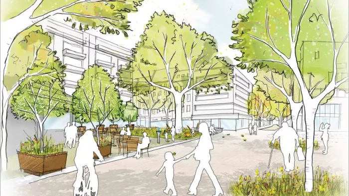 Das Zentrum des Platzes erhält eine besondere Qualität: Dieser Ort soll als sogenannter „Pocket Park“ mit Trinkbrunnen und Spielgelegenheiten neu gestaltet werden.