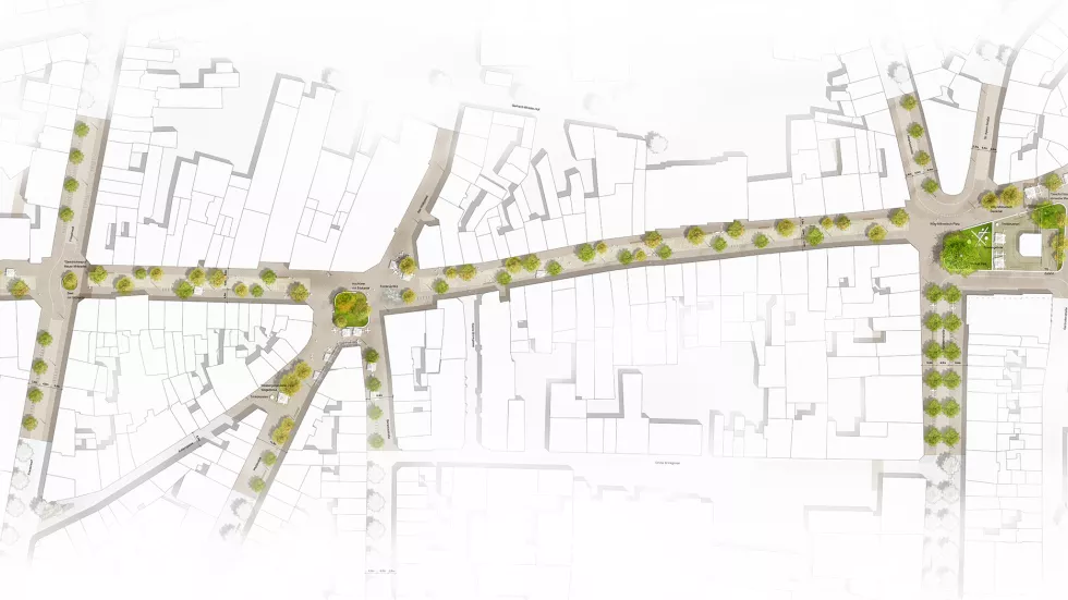 Der neue Boulevard wird beidseitig von Bäumen gesäumt. Diese stehen nicht, wie oftmals bei Straßen üblich, in Reih und Glied, sondern sind locker über den Straßenraum verteilt. Die Bestandsbäume bleiben erhalten und werden in die neuen Baumstellungen integriert.