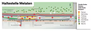 Der technische Plan zeigt die Haltestelle Melaten auf der Aachener Straße sowie einen Ausschnitt des Friedhofs Melaten aus der Vogelperspektive. Zudem sind die Einmündungen der Bruckner-, Pfitzner- und Richard-Strauß-Straße zu sehen. Geplante Ausbaumaßnahmen sind mit Nummern versehen, die im Text erklärt werden.